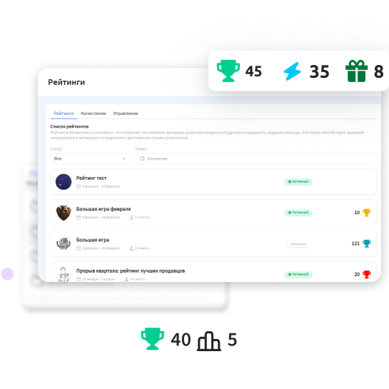 Мотивация работает тогда, когда люди понимают цели, видят прогресс и получают понятную обратную связь. Наша платформа помогает выстраивать такую систему: от прозрачных KPI до игровых механик и нематериальных поощрений. Все настраивается под конкретные роли и процессы — без сложных внедрений…