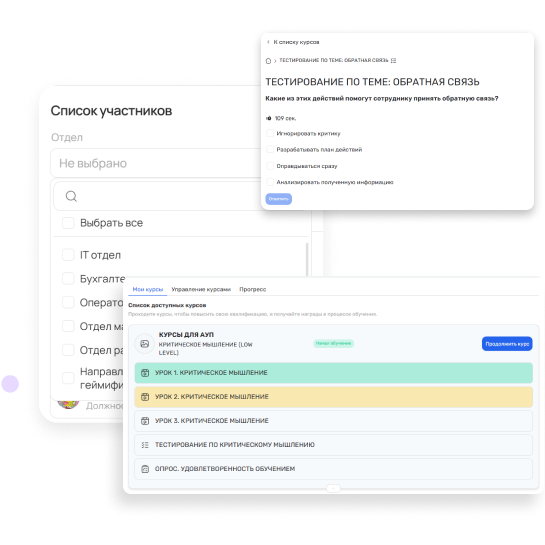 Обучение становится проще, когда все форматы: видео, тесты, диалоговые тренажеры и база знаний собраны в одном месте. Наша LMS помогает обучать большие и маленькие команды, быстро выводить сотрудников в работу и поддерживать единый уровень знаний.